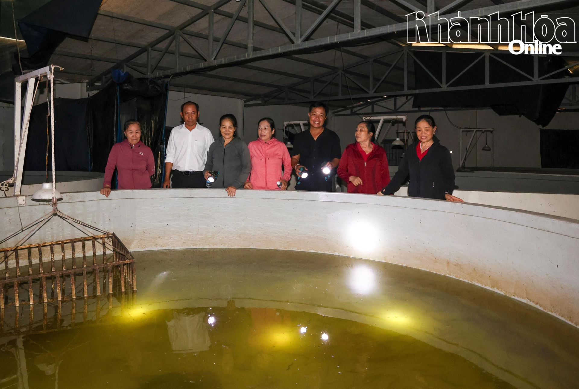 Nông dân xã Suối Dầu tham quan mô hình nuôi cá chình hoa trong bể xi măng tại Công ty TNHH Nuôi trồng thủy sản Vạn Xuân.