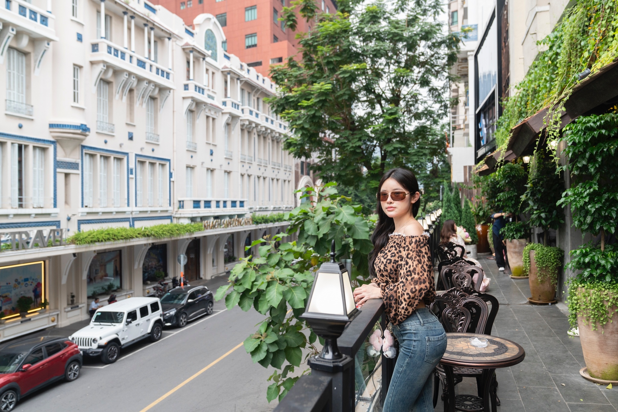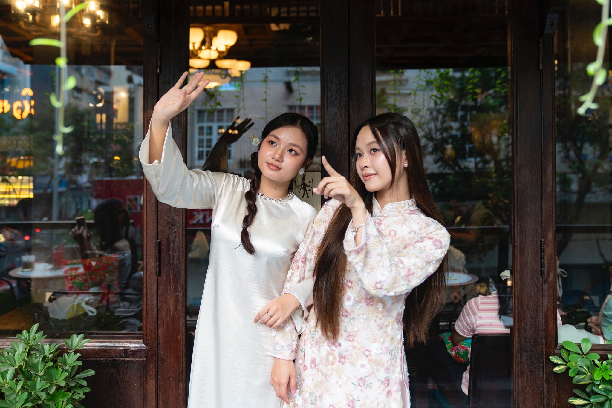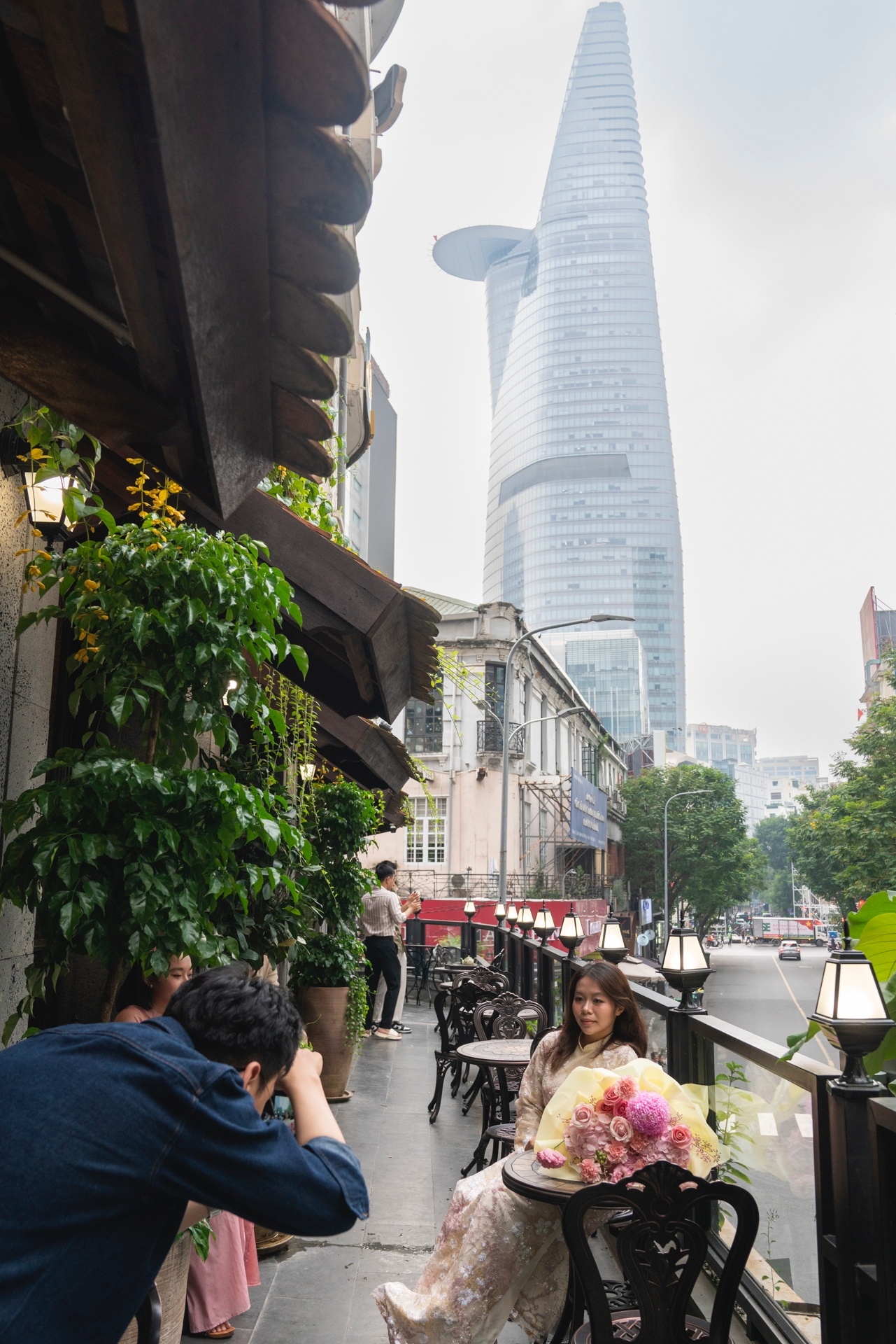 Trong khi đó, khu ban công ôm trọn ngã tư, hướng tầm nhìn ra tháp tài chính Bitexco - biểu tượng của TP.HCM - mang phong cách năng động, hiện đại. Đại diện quán cho biết hiện có hai tệp khách chính: nhóm yêu thích phong cách cổ điển, thường chọn không gian bên trong để chụp ảnh áo dài; và nhóm ưa phong cách sang trọng, tập trung ở khu ban công - cũng là tệp khách quen quay lại thường xuyên. Vào những khung giờ cao điểm, khách phải chờ mới đến lượt chụp ảnh tại các vị trí đẹp nhất như ban công.