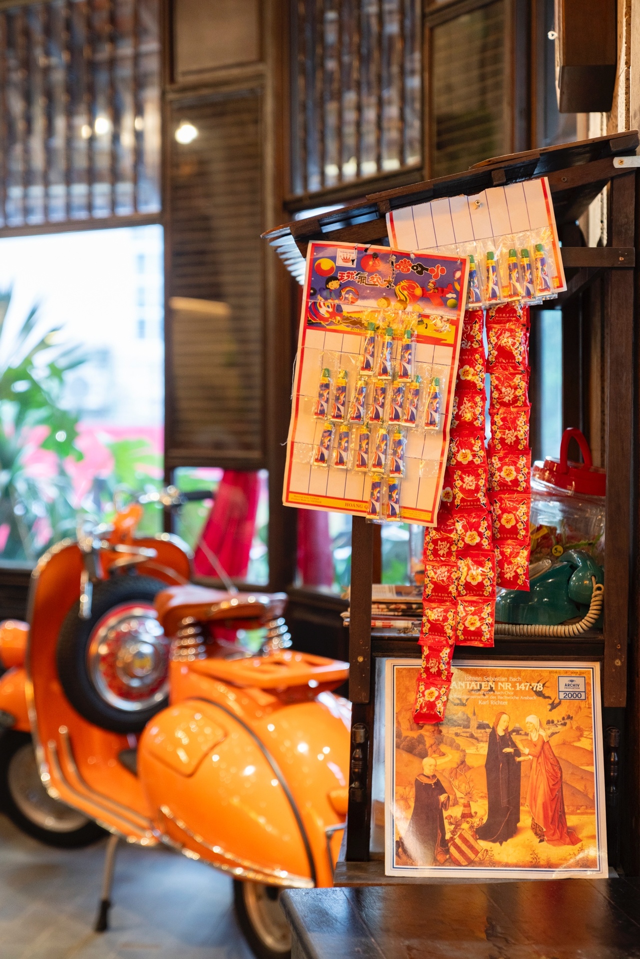Bên trong quán, không gian được bài trí với những bộ bàn ghế gỗ, sàn lát gạch bông, gối tựa mang họa tiết vải công phượng xanh - đỏ đặc trưng. Các vật dụng trang trí đều được chủ quán kỳ công sưu tầm, từ khung cửa sắt, tủ gỗ, bàn may đến chiếc xe Club, tái hiện sinh động, giàu màu sắc bầu không khí thành phố thập niên 1980. So với giai đoạn cũ (2018-2023), không gian quán được làm mới theo hướng sáng sủa, rộng rãi và chỉn chu hơn, khắc phục các hạn chế trước đây về ban công và bố cục.