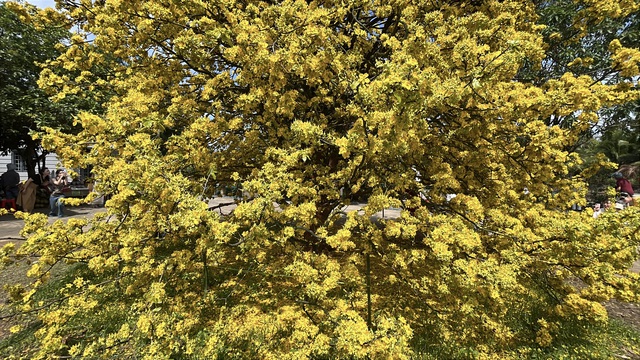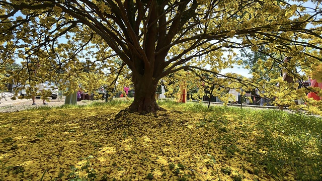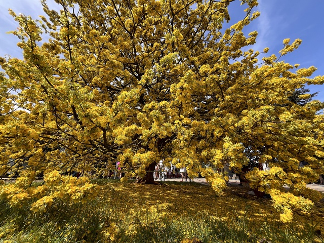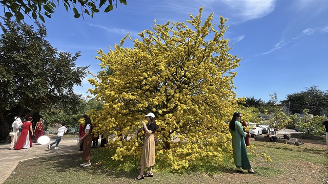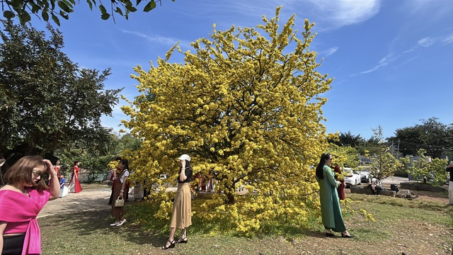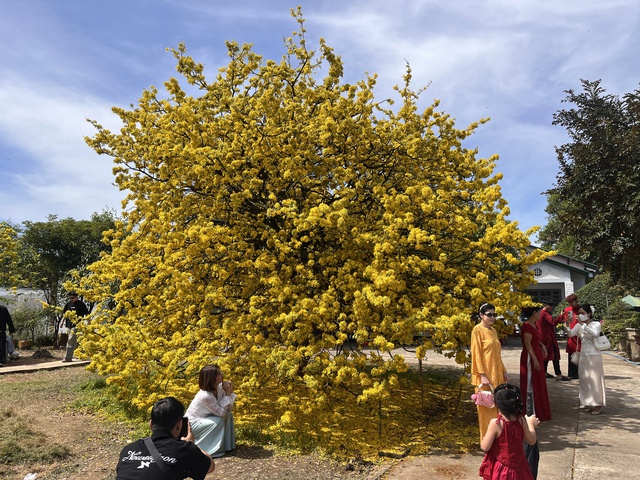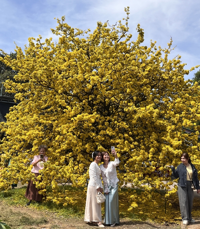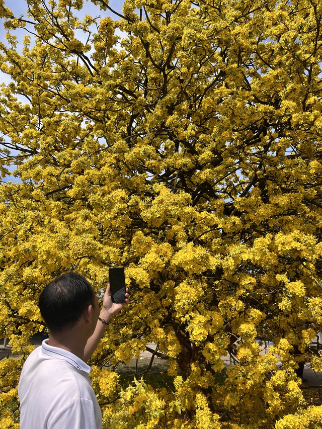 Toàn bộ cây mai kết thành một “quả cầu vàng” rực rỡ. Những cánh hoa nở rộ, chi chít, chen chúc nhau phủ lấp hoàn toàn cành lá, tạo nên một vẻ đẹp đồ sộ.