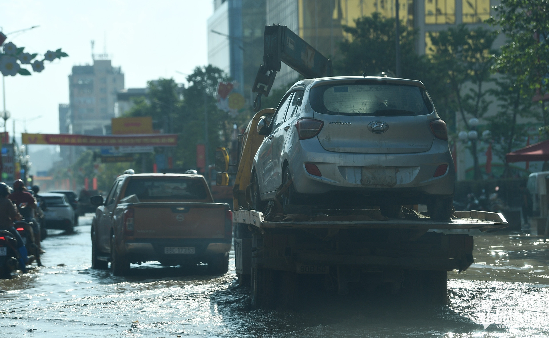 Đường phố trung tâm nườm nượp cảnh xe cứu hộ nối đuôi nhau đến điểm chở ô tô ngập nước.