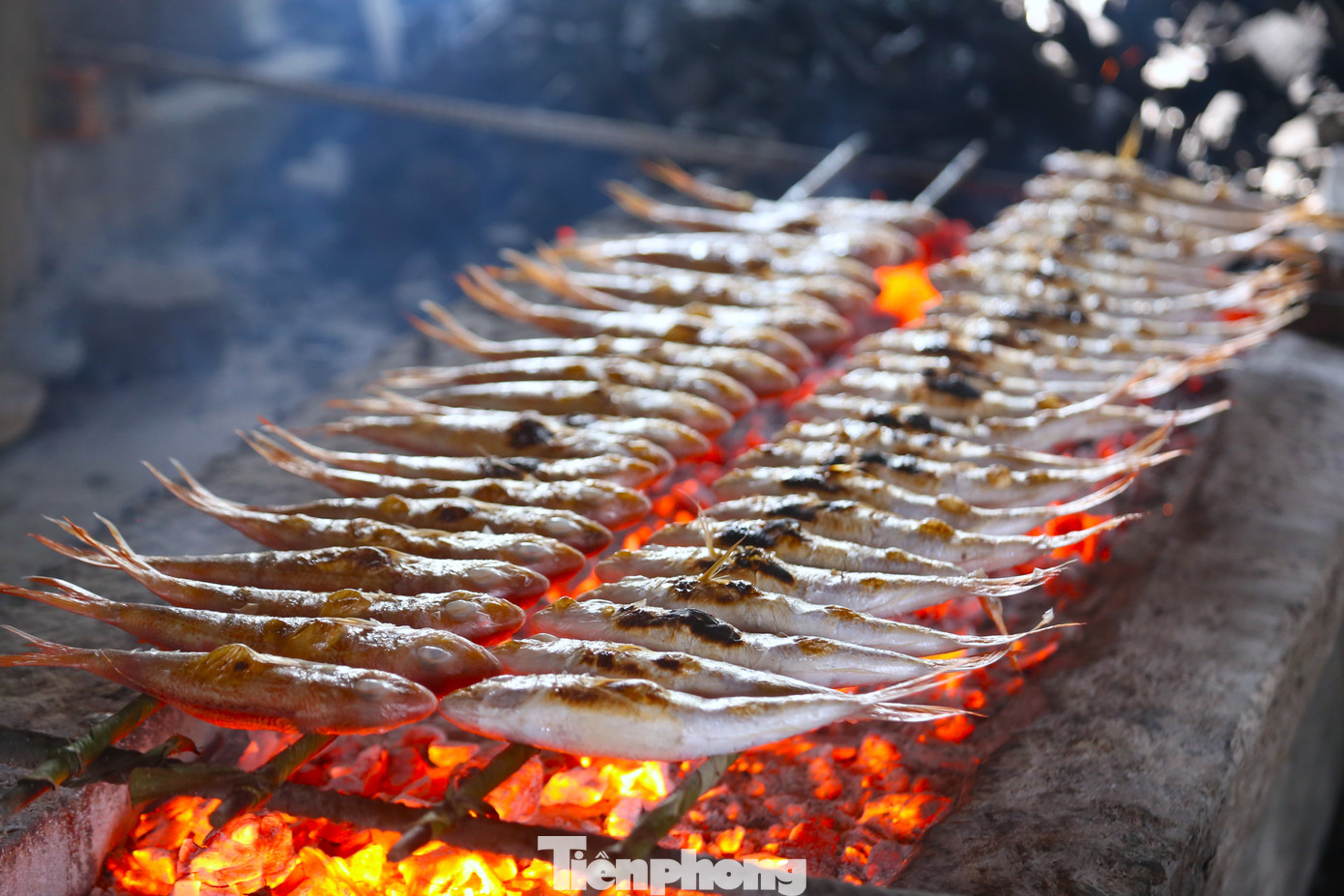 Những mẻ cá được xếp ngay ngắn trên bếp than hồng, khói quyện mùi cá chín thơm lừng. Không tẩm ướp gia vị, không phụ gia, cá được nướng hoàn toàn bằng than hoa để giữ trọn vị ngọt tự nhiên.