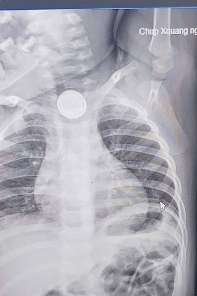 Qua thăm khám và chụp chiếu, các bác sĩ xác định dị vật mắc tại thực quản. Do lưu giữ nhiều ngày, niêm mạc thực quản đã bị bỏng nặng. Ngay sau đó, bệnh nhi được chỉ định nội soi gắp dị vật và hiện đang được theo dõi sát do nguy cơ biến chứng.