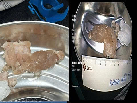 Hình ảnh miếng thịt (dị vật) được gắp ra thành công.