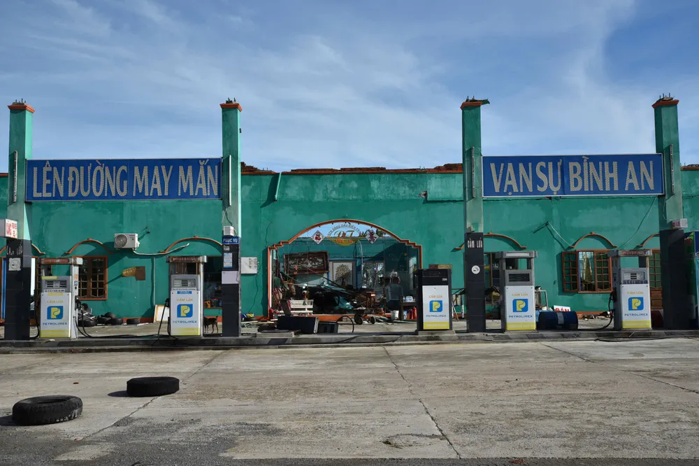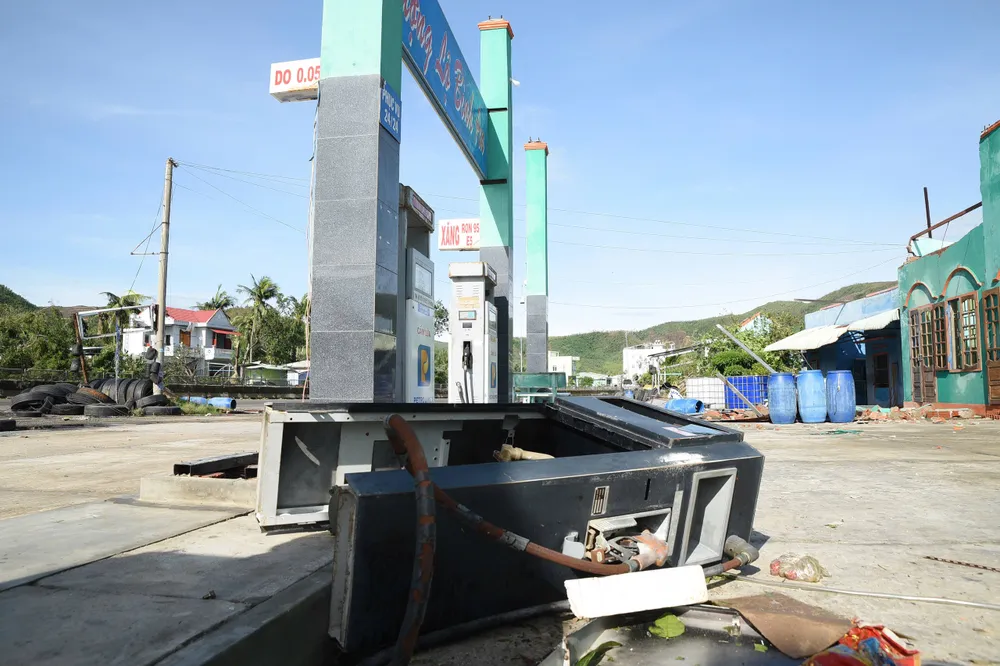 Sáng 7-11, ghi nhận của PLO toàn bộ vật dụng trong cây xăng này bị hư hỏng hoàn toàn, một trong hai mái tôn bay sang, đè sập mái hiên của một hộ dân nằm bên quốc lộ 1A, đối diện cây xăng.