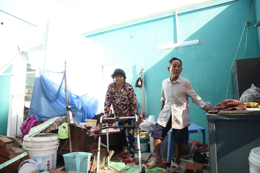 Vợ chồng ông Tô Đông cùng chung hoàn cảnh nhiều người khi căn nhà bị bão phá tan hoang.
