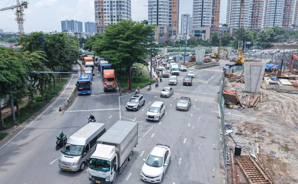 Trong khi đó, tại nút giao giữa Mai Chí Thọ và cao tốc TP.HCM - Long Thành, việc thi công cầu vượt cũng chiếm một diện tích khá lớn khiến phương tiện di chuyển khó khăn.