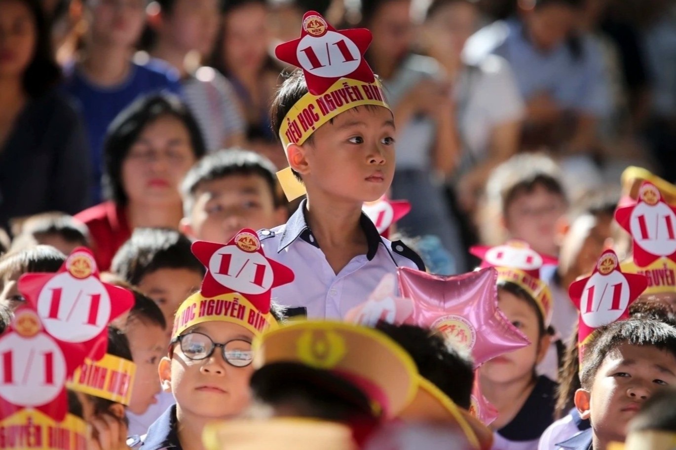 Học sinh lớp 1 trường Tiểu học Nguyễn Bỉnh Khiêm (TP.HCM) trong lễ khai giảng năm học 2025-2026. Ảnh: Quỳnh Danh.