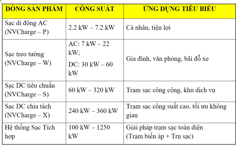 NVCharge cung cấp chuỗi sản phẩm linh hoạt, từ sạc di động đến hệ thống trạm sạc dải công suất rộng, đảm bảo đáp ứng mọi nhu cầu lắp đặt và vận hành.