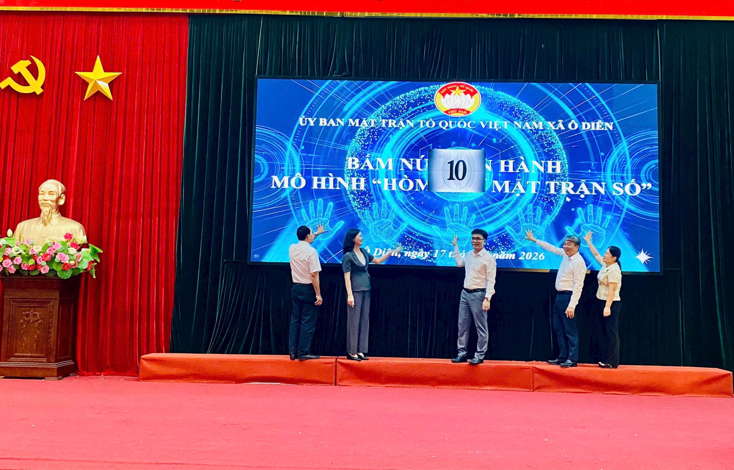 Các đồng chí lãnh đạo xã Ô Diên bấm nút ra mắt mô hình “Hòm thư Mặt trận số”. Ảnh: PV
