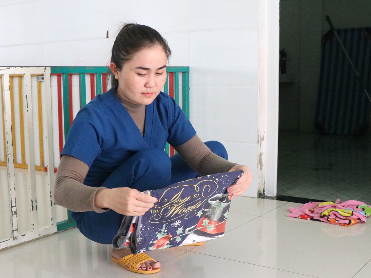 Giữa ca trực đầu xuân, mẹ Hải tranh thủ sắp xếp quần áo gọn gàng cho các con tại Làng Hòa Bình