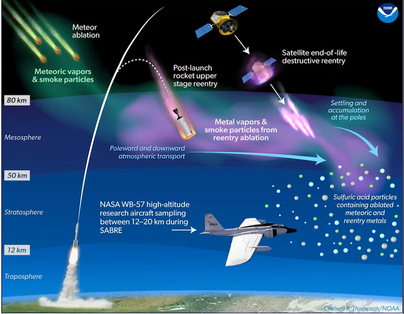 Vệ tinh và thiên thạch khi rơi vào khí quyển tạo ra các hạt kim loại và khói phản ứng – một nguồn ô nhiễm mới đang âm thầm tích tụ ở tầng bình lưu và đe dọa tầng ozone. (Nguồn: NOAA)