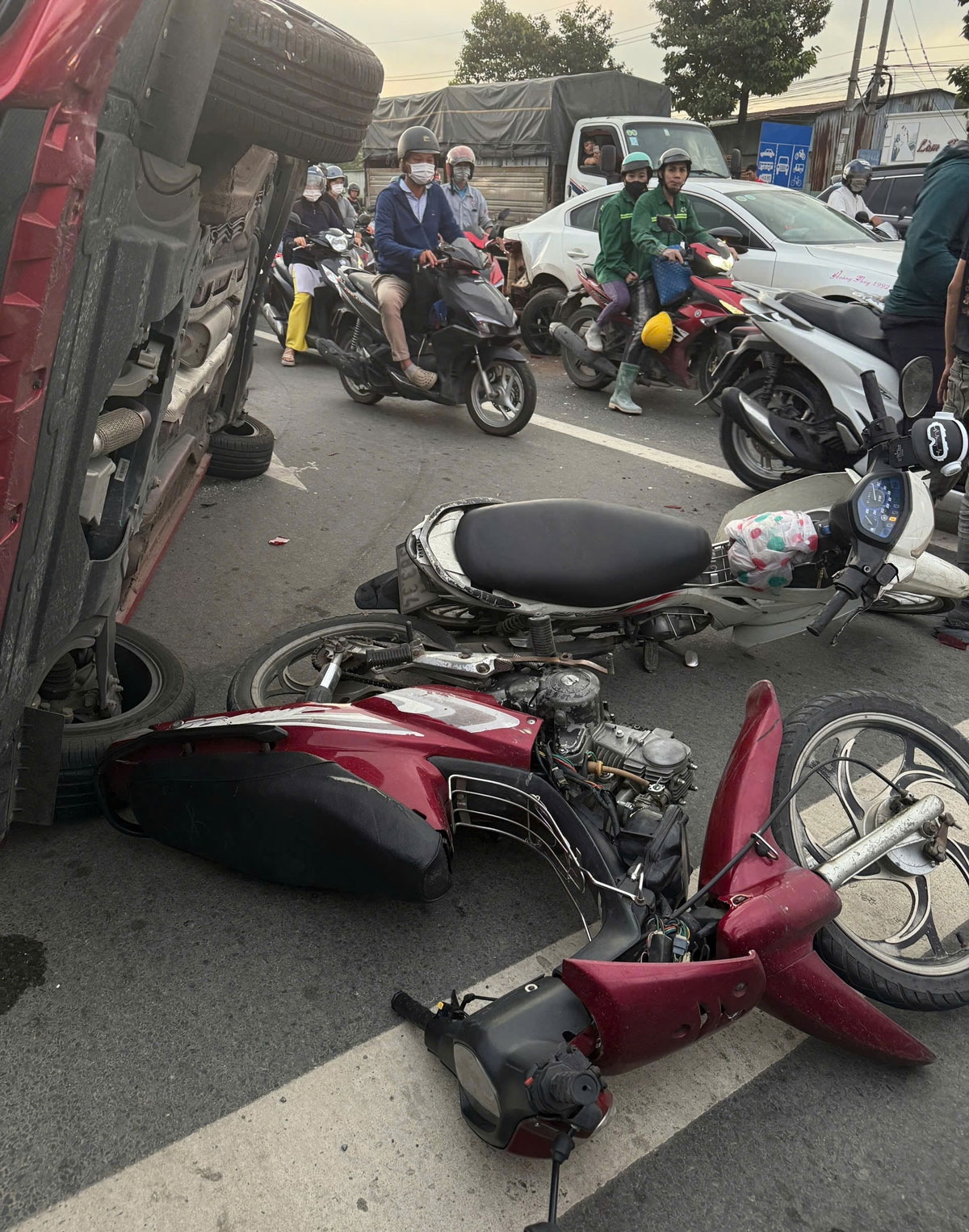 Tại hiện trường, nhiều xe máy bị hư hỏng nặng, mảnh vỡ phương tiện vương vãi khắp mặt đường. Trong đó, có một xe máy bị ô tô 5 chỗ đè lên.