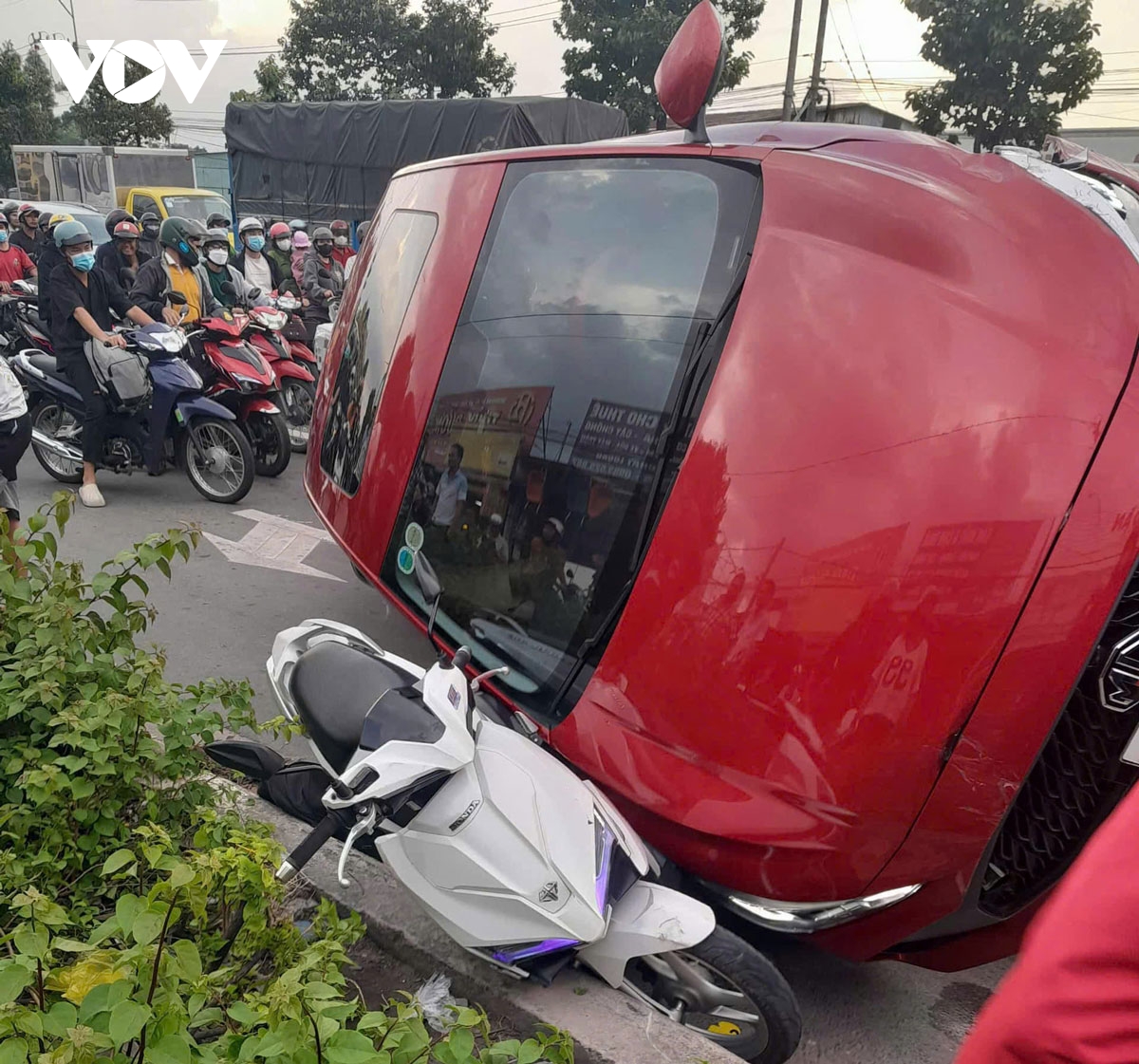 Chiếc ô tô bị nghiêng đè lên xe máy