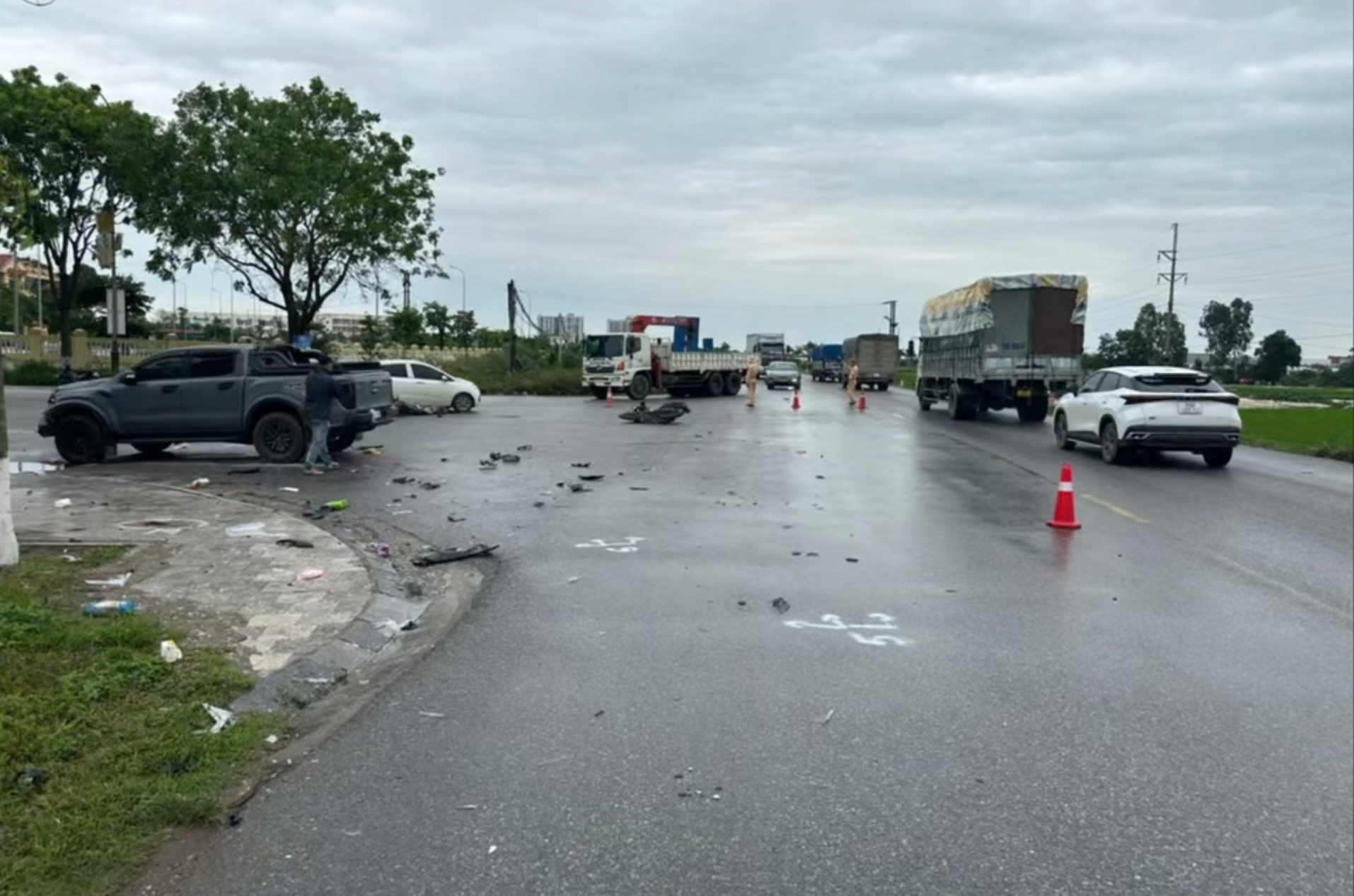 Vụ tai nạn khiến người đàn ông 50 tuổi điều khiển xe máy tử vong tại bệnh viện, người ngồi sau bị gãy chân, các phương tiện hư hỏng.