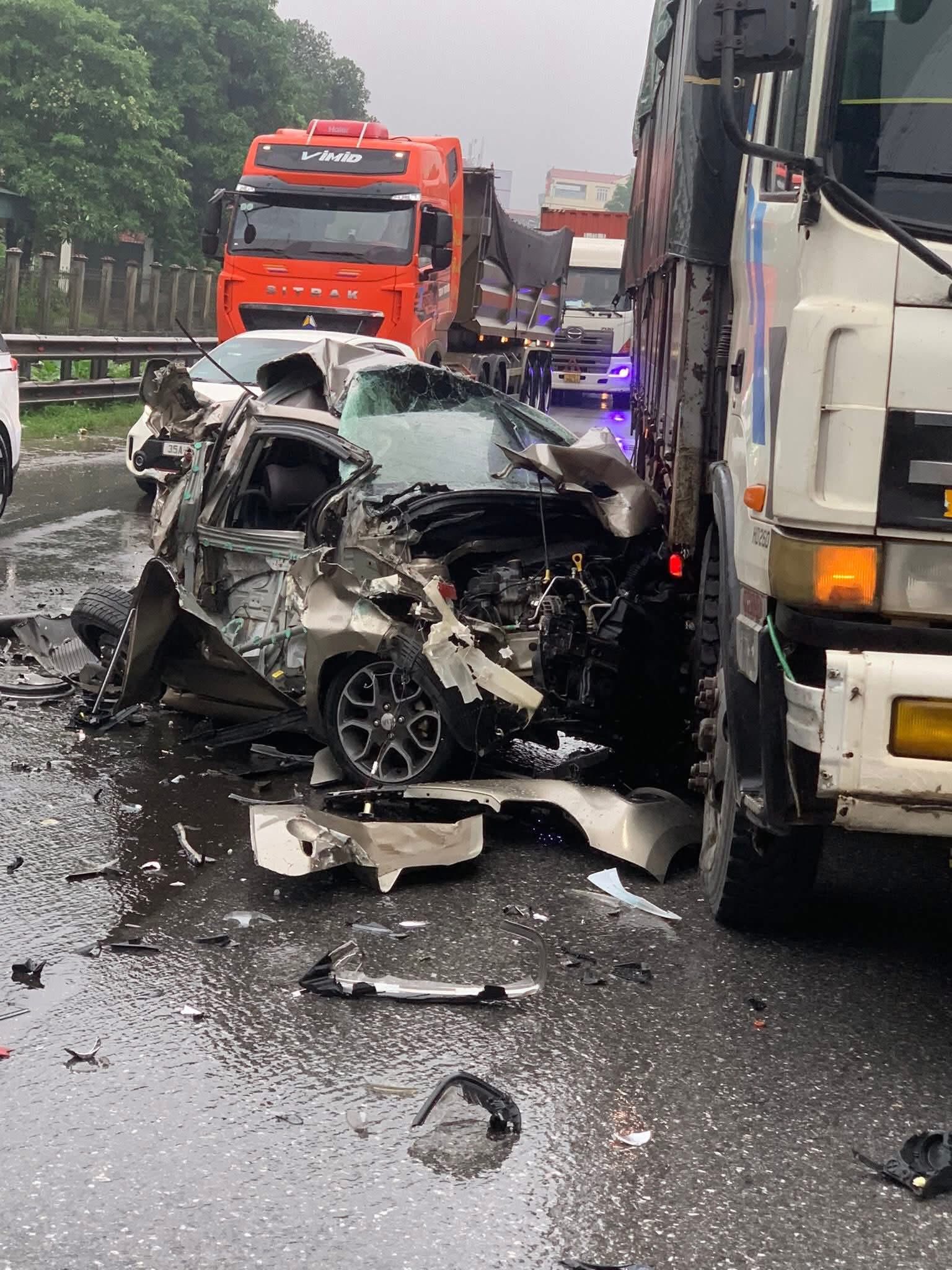 Vụ va chạm khiến ô tô văng mạnh vào gầm sau xe tải và bẹp dúm. Cùng với đó, cả ba phương tiện đều hư hỏng. Dù sau vụ va chạm, ô tô bị bẹp dúm, biến dạng hoàn toàn nhưng anh D. không hề bị thương mà đã tự chui ra bên ngoài khiến nhiều người bất ngờ.