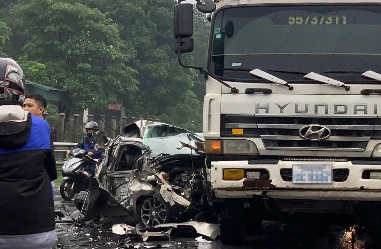 Xe ô tô con biến dạng sau vụ va chạm với xe tải trên Quốc lộ 1A ở Ninh Bình. Ảnh: MXH