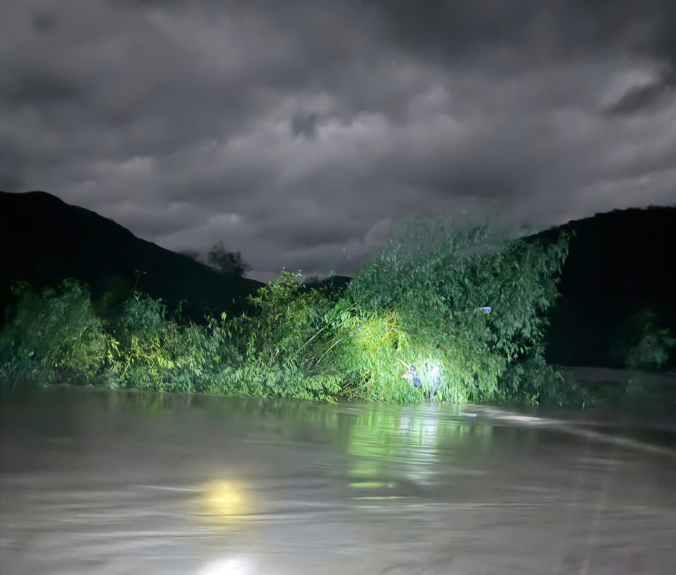 Hai người đàn ông này may mắn bám vào bụi tre thoát nạn nhưng bị mắc kẹt giữa dòng nước lớn. Nhận tin báo lực lượng chức năng cùng công an địa phương đã tiếp cận hiện trường quăng dây giải cứu thành công hai người đàn ông trên.