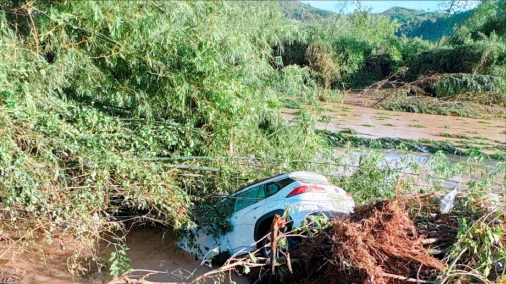 Ô tô bị nước cuốn xuống sông. Ảnh: C.A