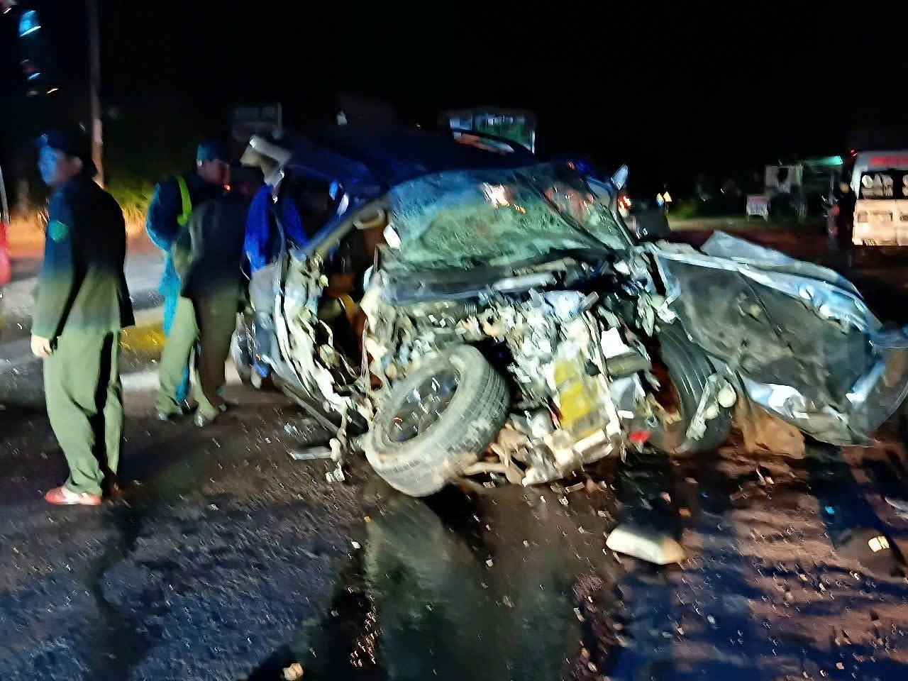 Cú tông mạnh khiến ô tô con biến dạng hoàn toàn. Hai người trên xe con là anh Đ.X (31 tuổi) và anh K.A.T (37 tuổi, cùng trú xã Tuy Đức, Lâm Đồng) tử vong tại chỗ. Tài xế P.H.Q bị thương.