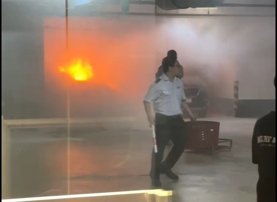 Bảo vệ tòa nhà dùng bình chữa cháy dập lửa khi phát sự việc