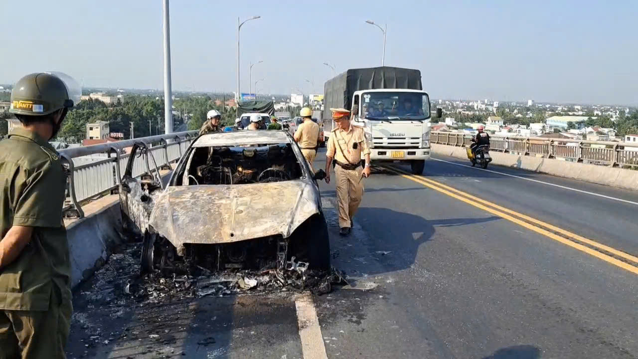 Lực lượng chức năng tỉnh Đồng Tháp đang điều tra nguyên nhân vụ ô tô 5 chỗ bốc cháy dữ dội trên cầu Rạch Miễu.