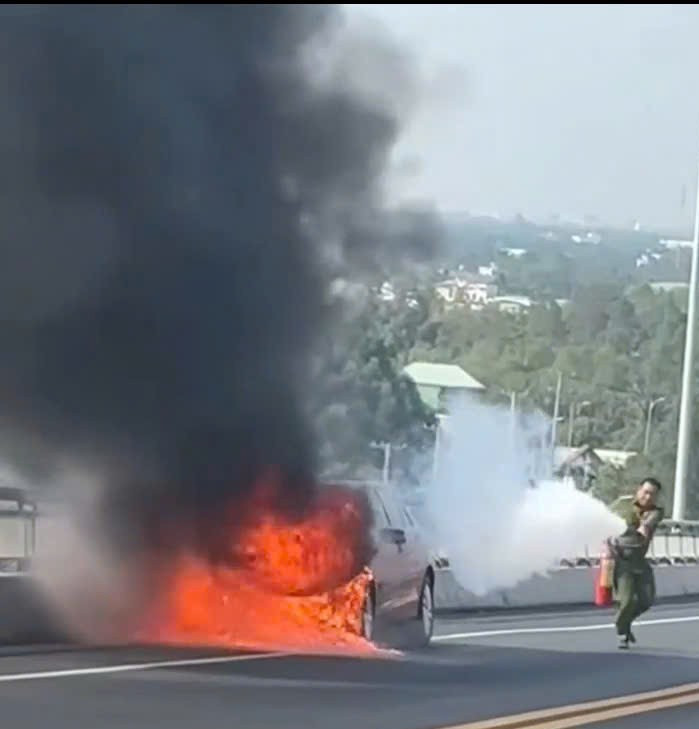 Khi xe vừa dừng, ngọn lửa đã bùng lên dữ dội, cột khói đen bốc cao.