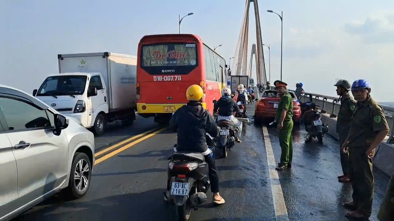 Vụ cháy xe làm giao thông qua cầu Rạch Miễu ùn tắc cục bộ.