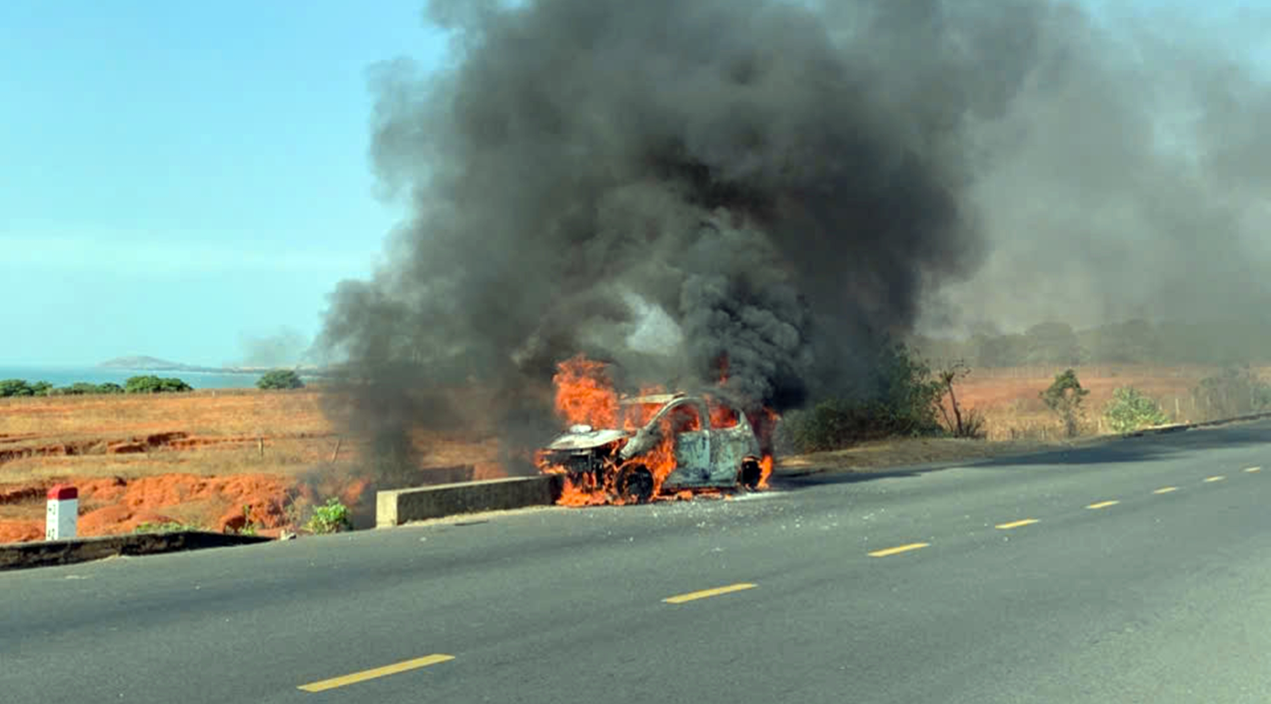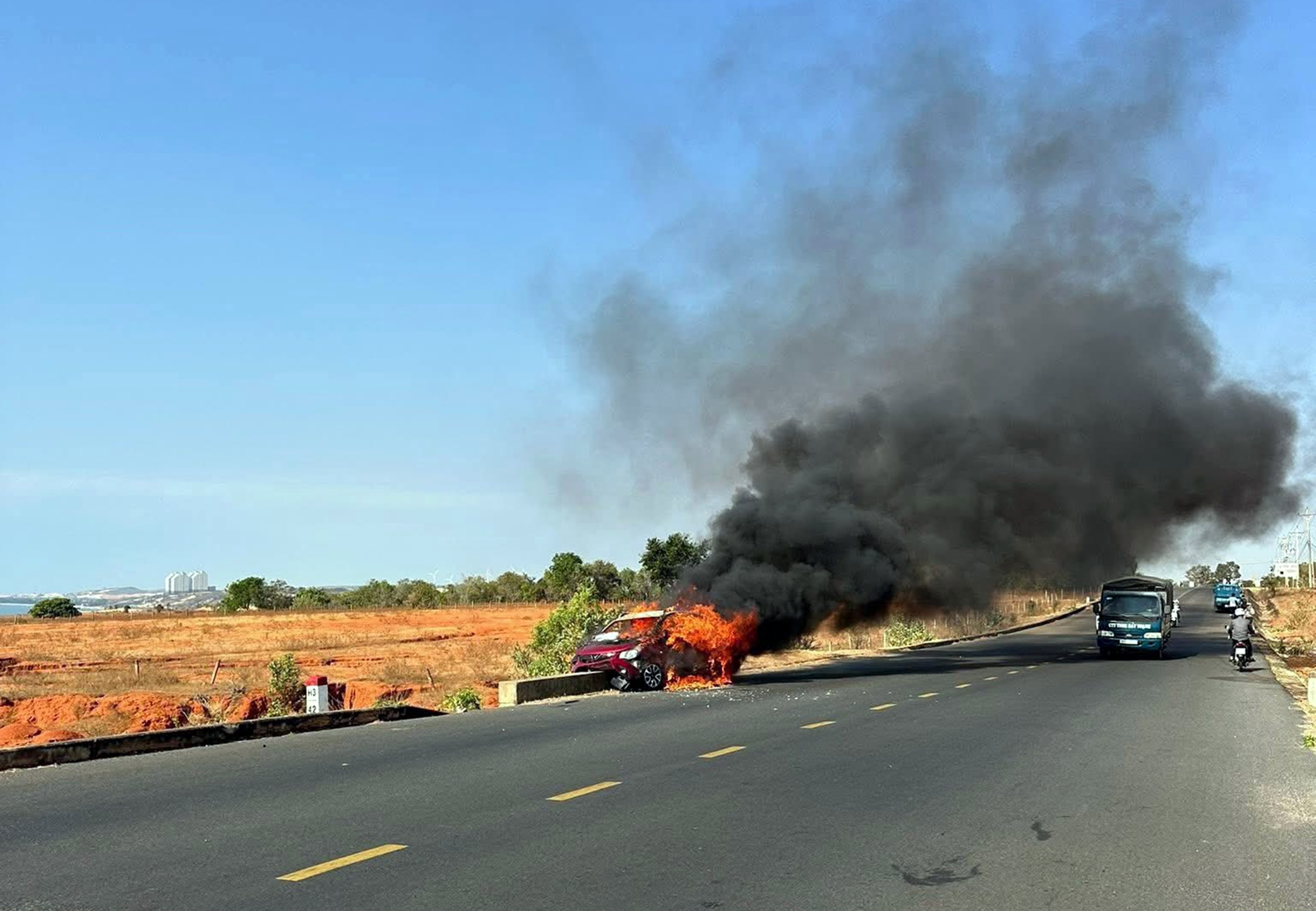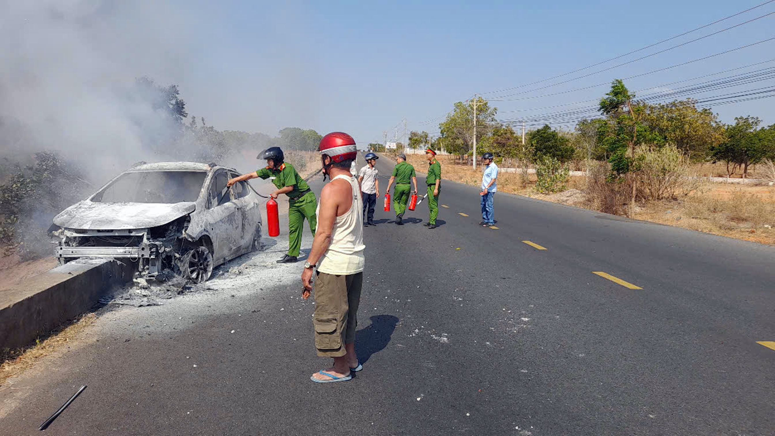 Sau cú va chạm mạnh, xe ô tô bốc cháy ngùn ngụt, nhiều người đi đường và Công an xã Hòa Thắng sử dụng bình chữa cháy mini để dập lửa nhưng ngọn lửa cháy quá lớn đã thiêu rụi hoàn toàn chiếc xe.