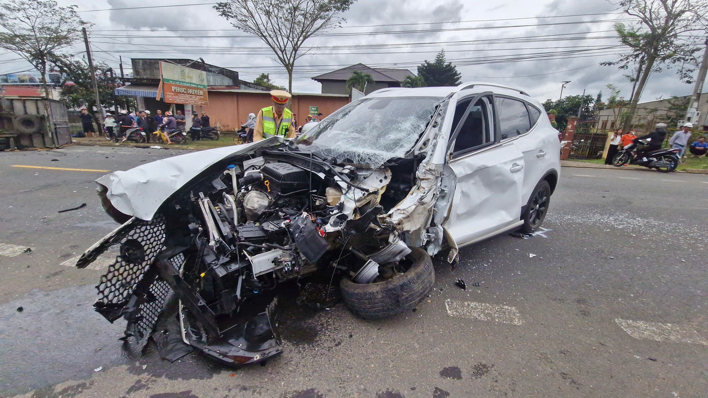 Cú va chạm mạnh khiến đầu xe ô tô con bẹp dúm, biến dạng hoàn toàn, nhiều mảnh vỡ văng xa gần 10 mét; bánh trước bên ghế tài xế ngồi lái bị gãy rời. Xe tải cũng bị lật nghiêng, hư hỏng nặng phần đầu và thân. Rất may, 3 người trên hai xe không bị thương.