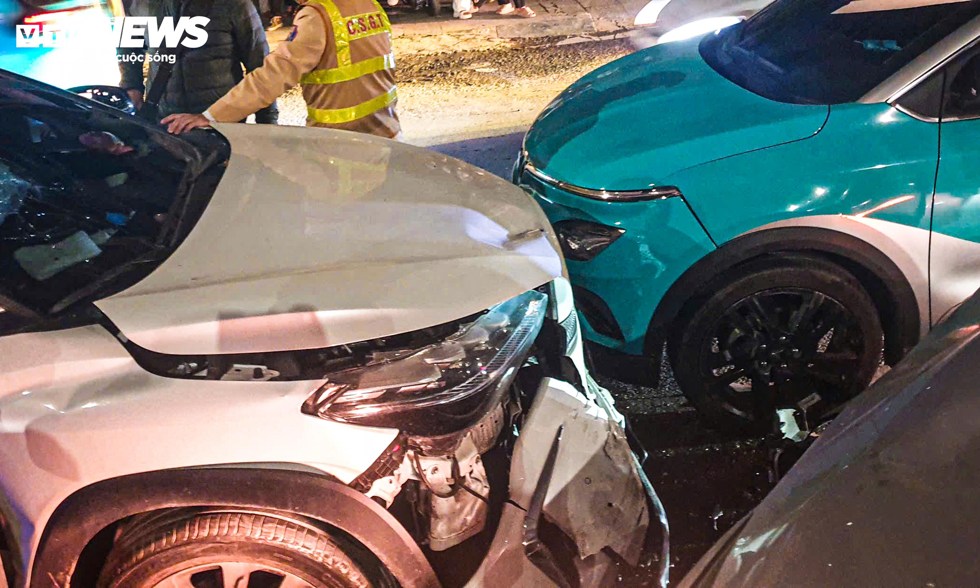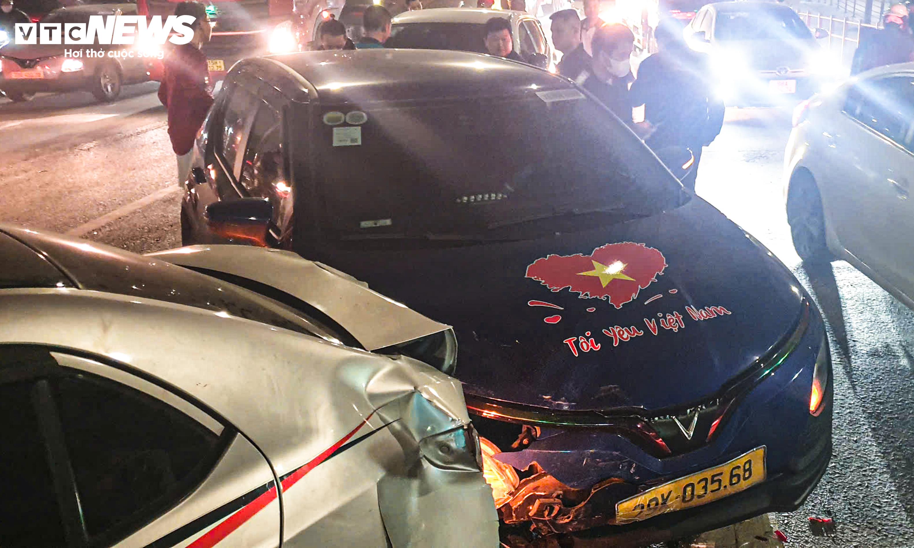Sau cú tông ban đầu, ô tô màu xanh mang biển kiểm soát 29K-035.XX chạy phía sau một taxi đã không kịp xử lý tình huống, đâm vào đuôi xe phía trước, tạo thành va chạm liên hoàn.