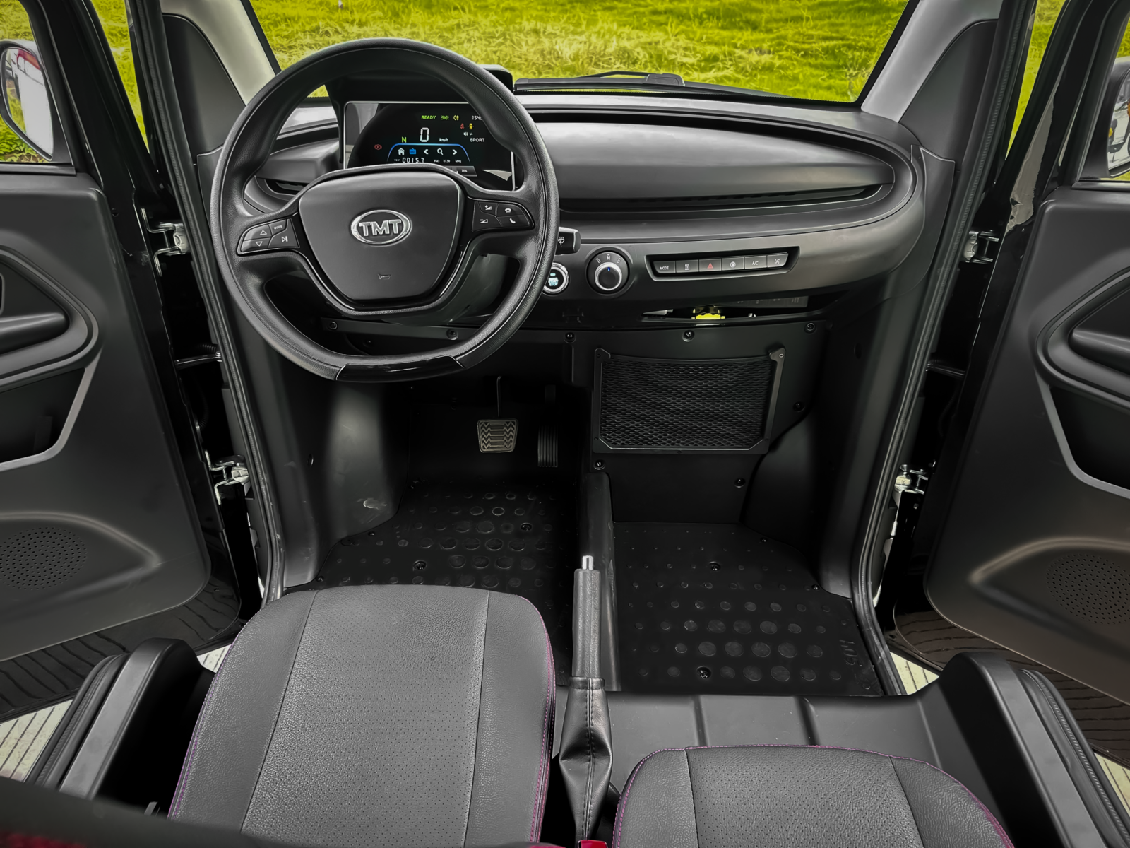 Không gian nội thất được thiết kế tối giản cho hai người ngồi. Bảng điều khiển trung tâm là màn hình 5 inch hiển thị các thông tin về tốc độ, chế độ lái và dung lượng pin. Dù không có màn hình giải trí đa phương tiện, xe vẫn đảm bảo các tiện nghi cơ bản như điều hòa không khí, kính chỉnh điện, cổng sạc USB và giá đỡ điện thoại di động.