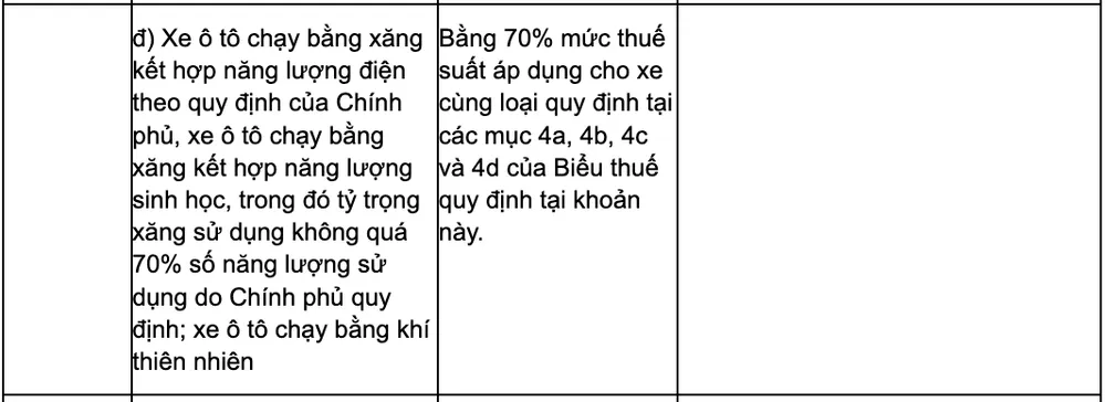 Khoản 1 Dự thảo quy định: Đối với xe ô tô chạy bằng xăng kết hợp năng lượng điện quy định tại mục 4đ Biểu thuế TTĐB tại Điều 8 Luật Thuế TTĐB là xe ô tô chạy bằng xăng kết hợp năng lượng điện theo quy định của Bộ Xây dựng có tỷ lệ xăng sử dụng không quá 70% tổng số năng lượng sử dụng.