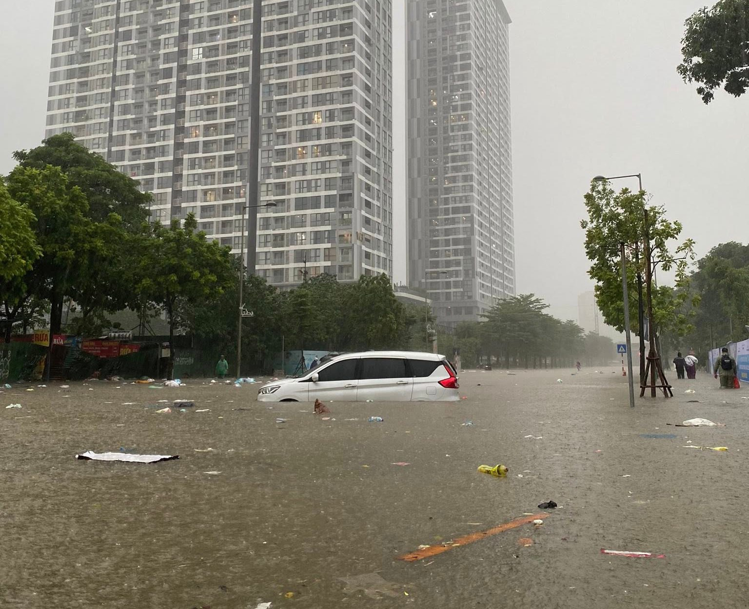 Chiếc KIA Canival bị mất lái nổi giữa "biển nước" ở khu vực gần tòa nhà Keangnam. Ảnh: LĐ