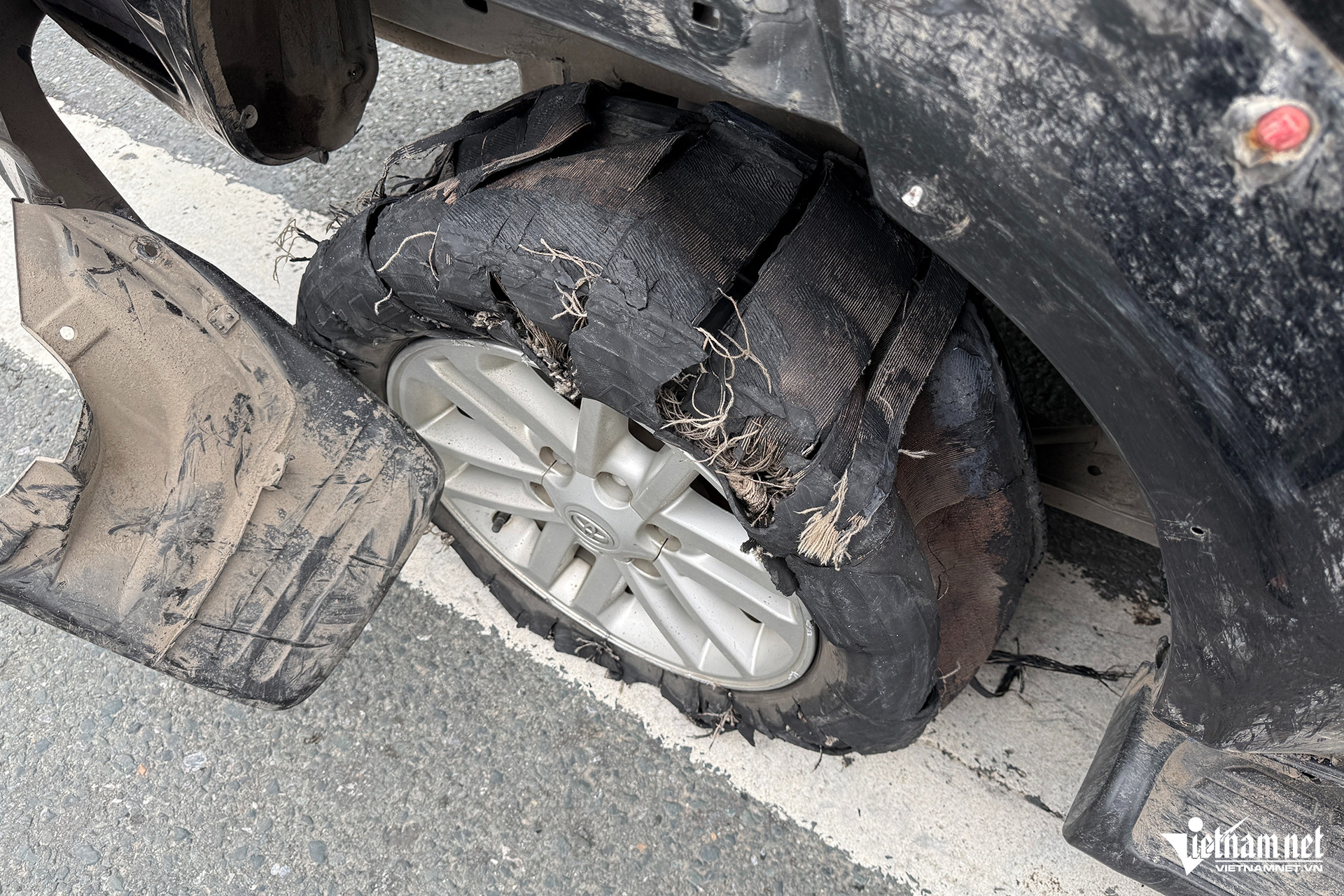 Lốp ô tô bị vỡ, tước nát phần vỏ. Ảnh: Đình Hiếu