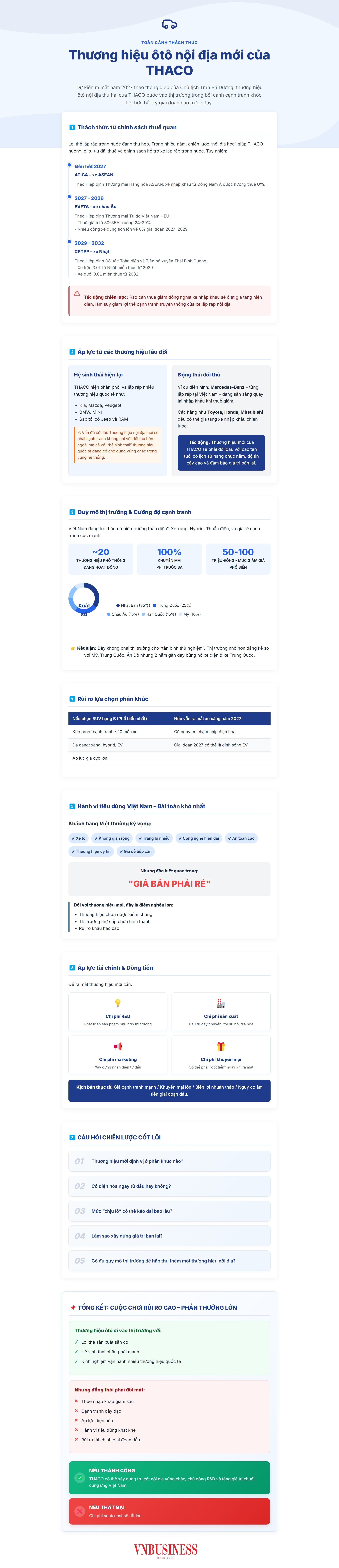 Cơ hội không phải không có, nhưng rủi ro tài chính trong giai đoạn đầu là rất lớn. Bài toán đặt ra không chỉ là ra mắt một mẫu xe, mà là khả năng chịu lỗ bao lâu để xây dựng thương hiệu và đạt quy mô đủ lớn nhằm cân bằng tài chính. Thành bại của thương hiệu ôtô nội địa thứ hai sẽ phụ thuộc vào việc THACO có sẵn sàng bước vào cuộc cạnh tranh khốc liệt nhất lịch sử thị trường xe Việt hay không.