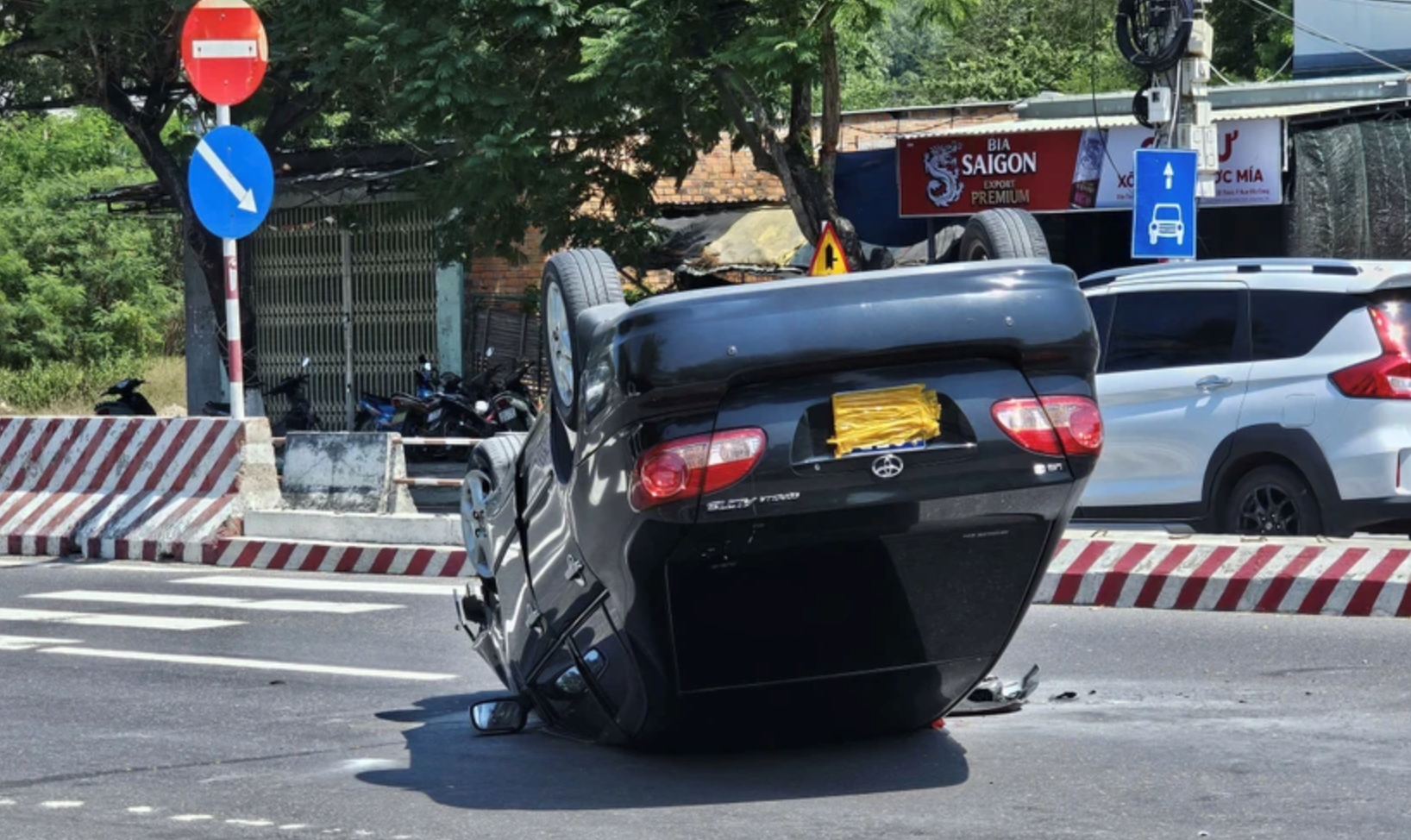 Hiện trường vụ tai nạn giao thông khiến chiếc ô tô 4 chỗ lật ngửa giữa đường.
