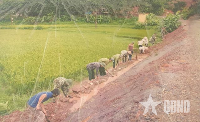 Cán bộ, chiến sĩ Trung đoàn 42 tham gia tu sửa đường giao thông của xã Điền Xá, tỉnh Quảng Ninh.