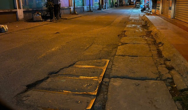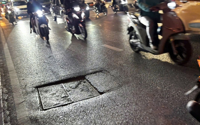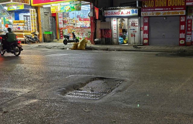 Tại đường Nguyễn Hoàng (khu vực gần bến xe Mỹ Đình), mặt đường xuất hiện nhiều vị trí lồi lõm, vỡ vụn. Một số nắp cống bị lệch hoặc không đồng bộ với cao độ mặt đường, tiềm ẩn rủi ro cho người tham gia giao thông, nhất là vào ban đêm hoặc khi tầm nhìn bị hạn chế.
