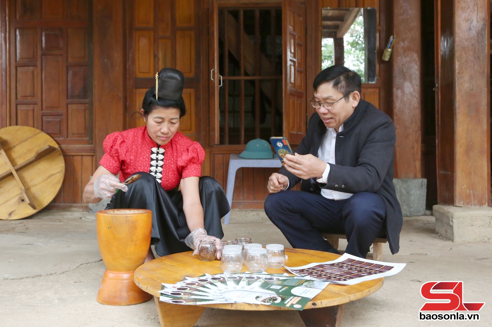 Gia đình ông Quàng Văn Tưởng, bản Ban Xa, xã Mường Khiêng quảng bá sản phẩm OCOP 3 sao chẳm chéo La Ha trên mạng xã hội.