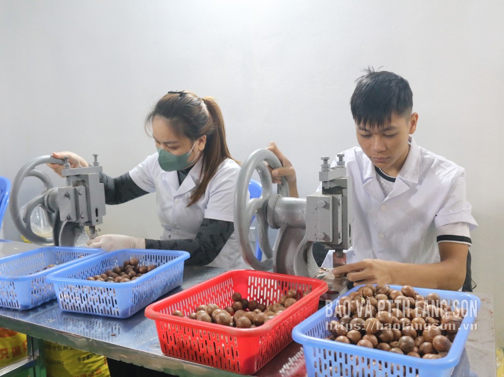 Công nhân Công ty Cổ phần mắc ca Hoàng Liên Lạng Sơn chế biến hạt mắc ca