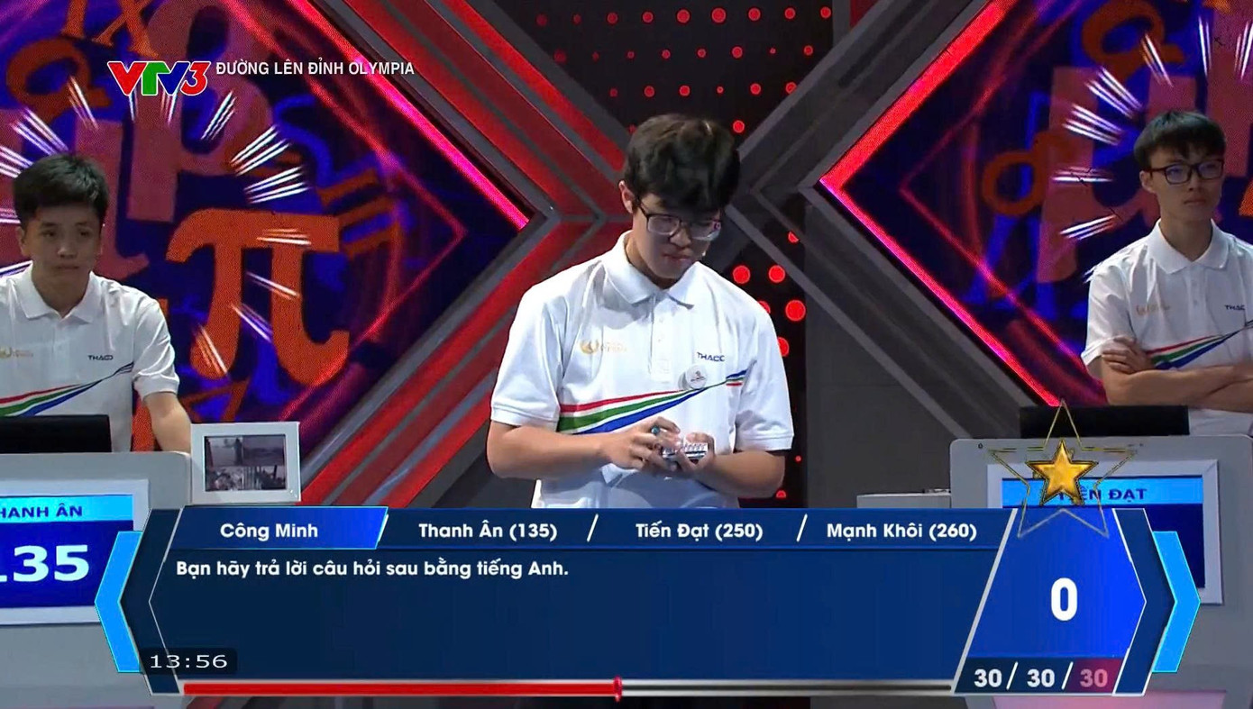 Công Minh lựa chọn gói câu hỏi trị giá 30 điểm 3 câu. Câu hỏi đầu tiên, nam sinh vụt mất 30 điểm vào tay Mạnh Khôi. Với câu trả lời đúng, Mạnh Khôi đã lấy lại ngôi đầu bảng với 260 điểm. Công Minh tiếp tục mất 30 điểm vào tay Thanh Ân. Ở câu hỏi cuối cùng, Mạnh Khôi tiếp tục gia tăng điểm số lên 290 điểm.
