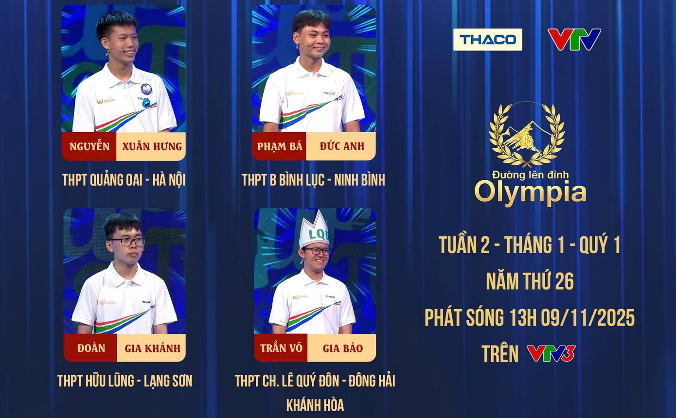 2 - Tháng 1 - Quý 1 với sự tham gia tranh tài của 4 thí sinh: Nguyễn Xuân Hưng (trường THPT Quảng Oai - Hà Nội), Phạm Bá Đức Anh (trường THPT B Bình Lục - Ninh Bình), Đoàn Gia Khánh (trường THPT Hữu Lũng - Lạng Sơn) và Trần Võ Gia Bảo (trường THPT chuyên Lê Quý Đôn - Đông Hải, Khánh Hòa).