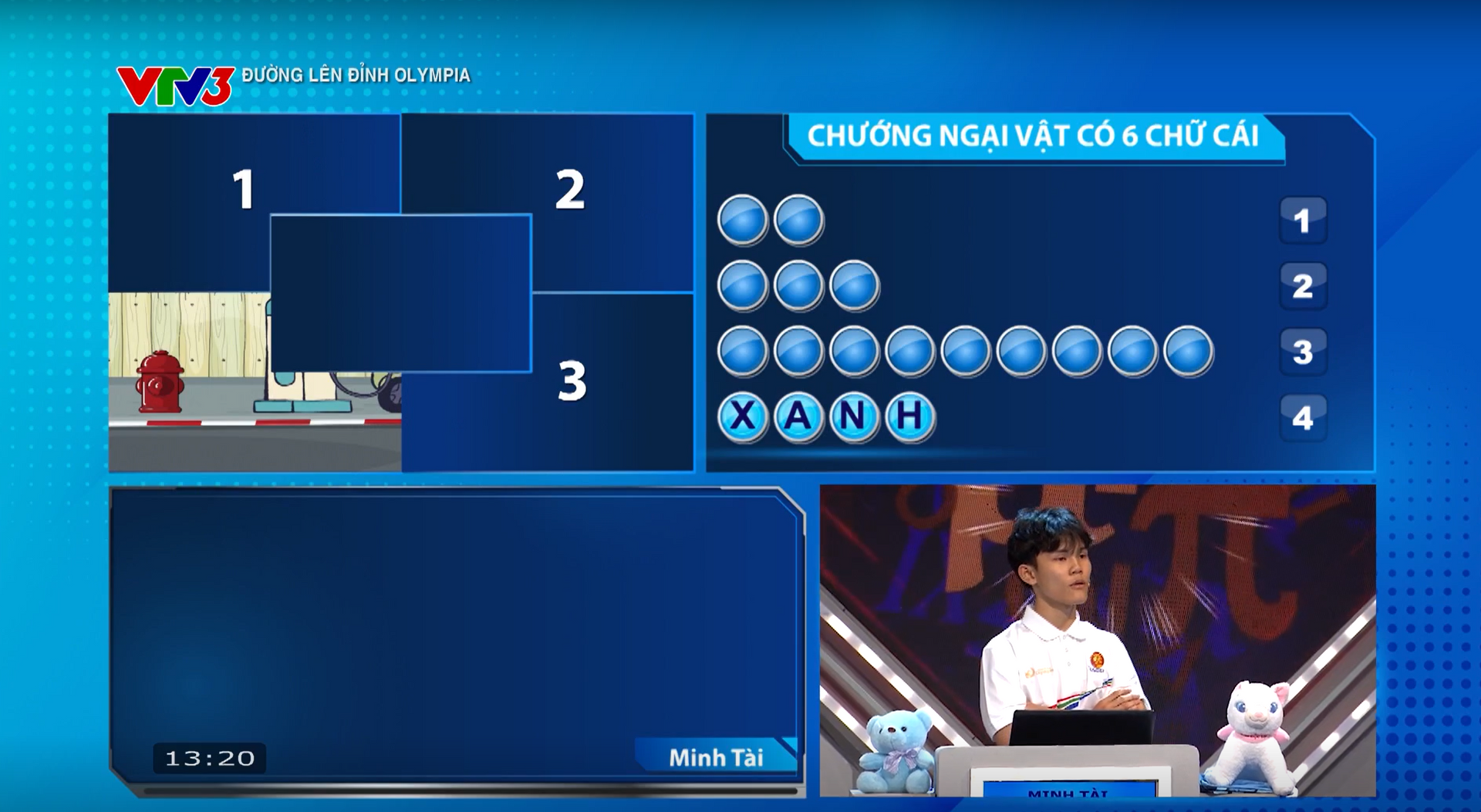 Tại phần thi Vượt chướng ngại vật, Minh Tài tiếp tục thể hiện sự nhạy bén khi nhanh chóng giải được từ khóa "xe điện" ngay sau mảnh ghép đầu tiên. Câu trả lời chính xác giúp nam sinh đến từ Gia Lai nâng tổng điểm lên 145, tạo khoảng cách lớn với các đối thủ còn lại, lúc này Gia Bảo vẫn giữ mức 15 điểm.