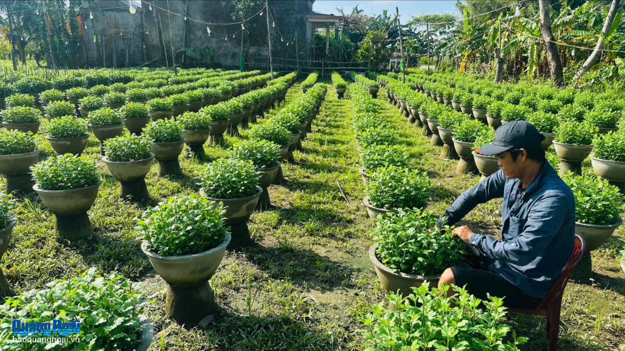 Ông Bùi Đình Hoàng ở xã Vệ Giang chăm sóc, khôi phục cácchậu hoa cúc sau mưa bão. ẢNH: MỸ HOA