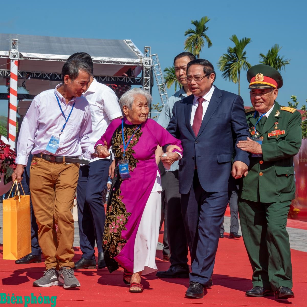 Thủ tướng Chính phủ Phạm Minh Chính hỏi thăm sức khỏe Mẹ Việt Nam Anh Hùng Ngô Thị Lùng và Anh Hùng lực lượng vũ trang Ngô Thanh Trang về dự lễ. Ảnh: Lê Văn Chương