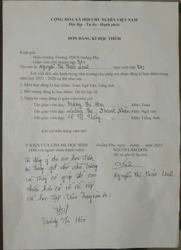 Học sinh cuối cấp tự nguyện đăng ký ôn thi phải có đơn xác nhận của phụ huynh.