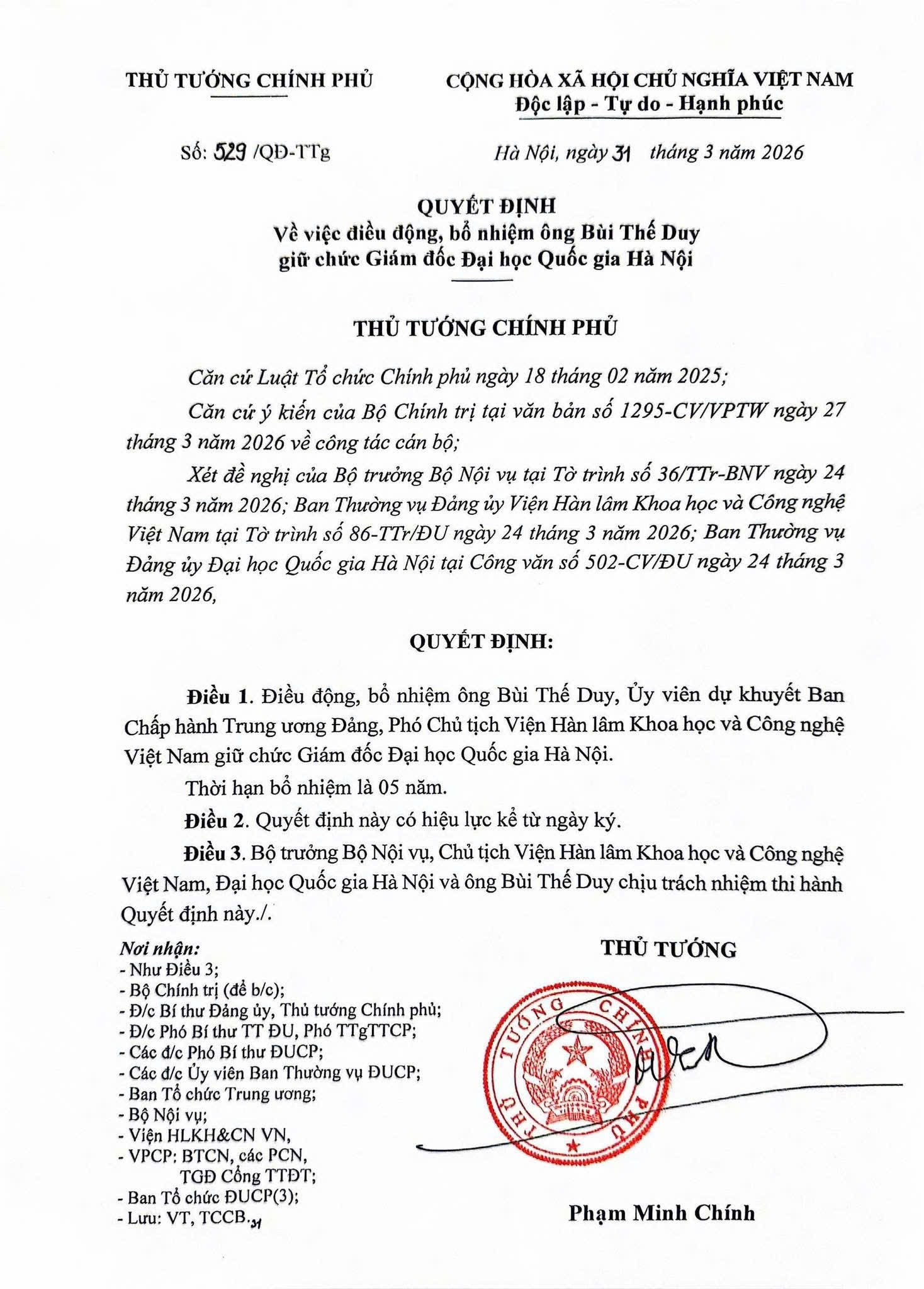 Ngày 31/3, Thủ tướng Chính phủ Phạm Minh Chính ký Quyết định số 529/QĐ-TTg ngày 31/3/2026 điều động, bổ nhiệm ông Bùi Thế Duy, Ủy viên dự khuyết Ban Chấp hành Trung ương Đảng, Phó Chủ tịch Viện Hàn lâm Khoa học và Công nghệ Việt Nam giữ chức Giám đốc Đại học Quốc gia Hà Nội.