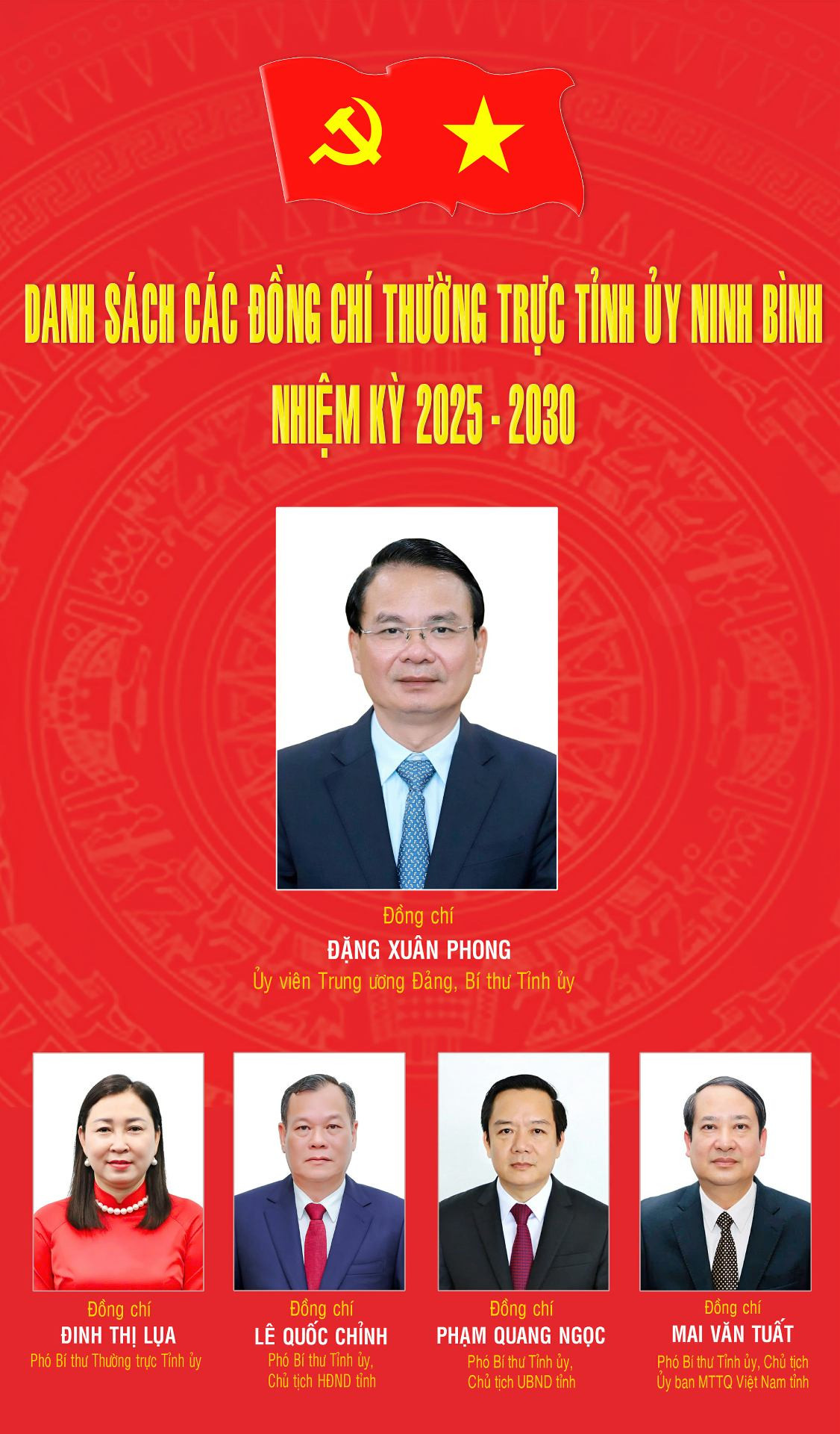 Nhân sự được chỉ định làm Phó bí thư Tỉnh ủy Ninh Bình nhiệm kỳ 2025–2030 gồm: bà Đinh Thị Lụa, Phó bí thư thường trực Tỉnh ủy; ông Phạm Quang Ngọc, Phó bí thư, Chủ tịch UBND tỉnh; ông Lê Quốc Chỉnh, Phó bí thư, Chủ tịch HĐND tỉnh và ông Mai Văn Tuất, Phó bí thư, Chủ tịch Ủy ban Mặt trận Tổ quốc Việt Nam tỉnh.