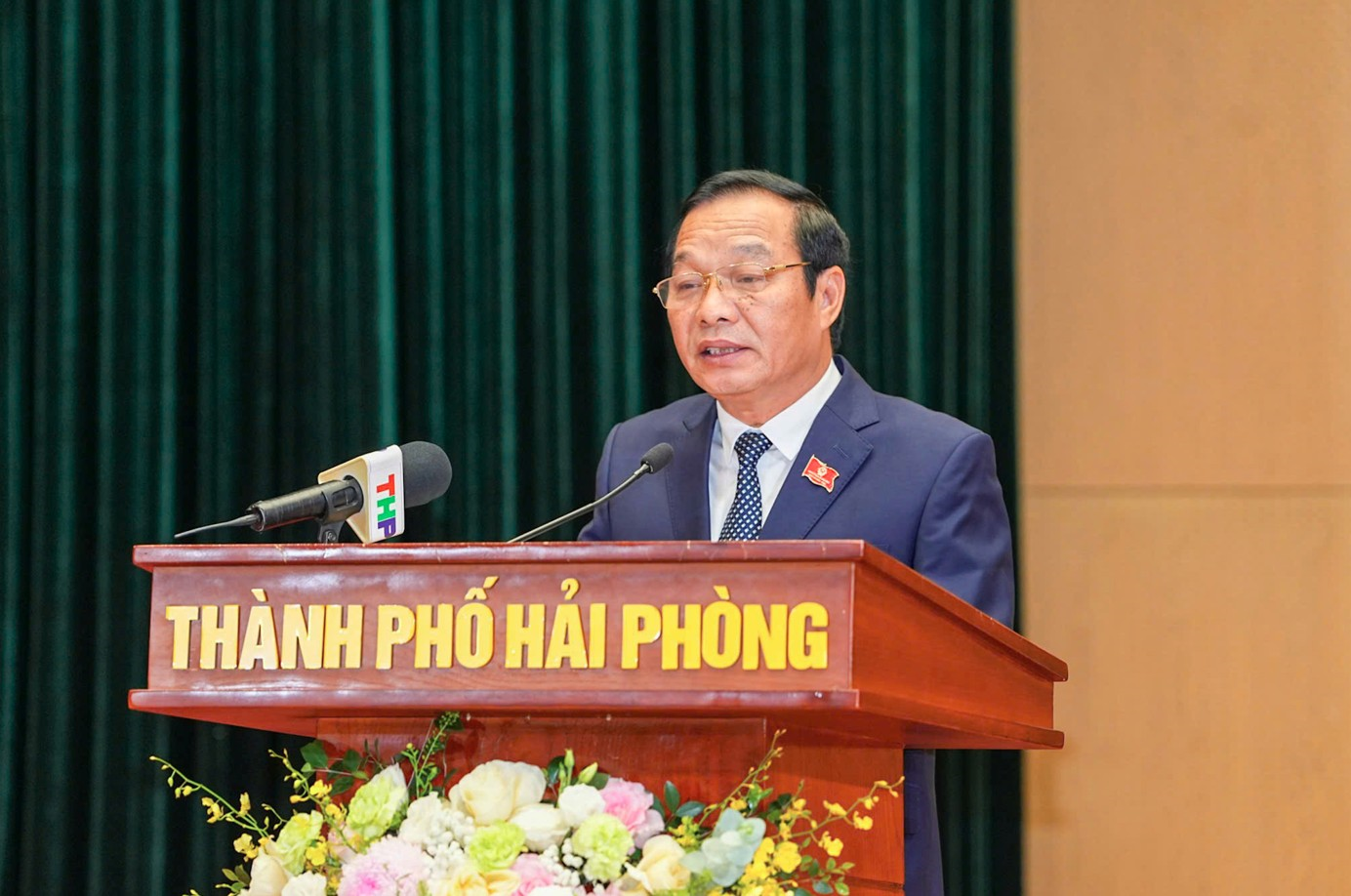 Chủ tịch HĐND TP Hải Phòng Lê Văn Hiệu phát biểu nhận nhiệm vụ. Ảnh: UBND TP Hải Phòng